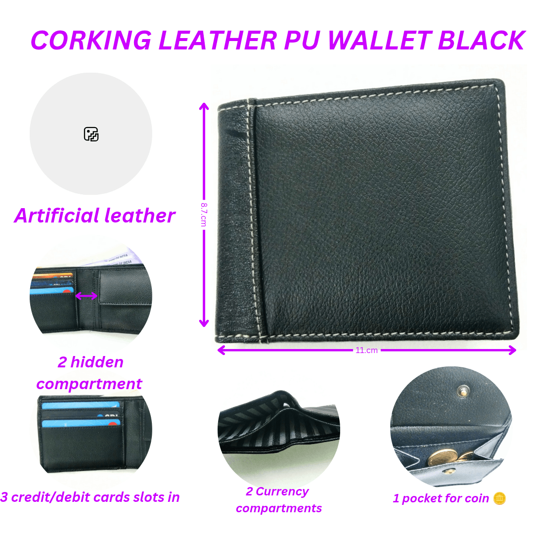 corking artificial leather wallet is handcrafted wallet is made from premium, supple artificial leather, offering a stylish and durable option for your everyday essentials. More than just a place to keep your cash, it’s a subtle statement of your personal style. The carefully considered interior features two full-length compartments for notes, three dedicated slots for credit or debit cards, and two discreet hidden pockets ideal for receipts, extra cards, or small valuables. A separate coin pocket keeps loose change organised and prevents it from cluttering the wallet.Its slim profile, measuring just (11.cm by 8.7cm) ensures a comfortable fit in any pocket or bag without adding bulk. The durable construction and high-quality materials guarantee long-lasting use, making this wallet a worthwhile investment. Whether you’re treating yourself or looking for a thoughtful gift, this handcrafted artificial leather wallet combines style, practicality and excellent value.