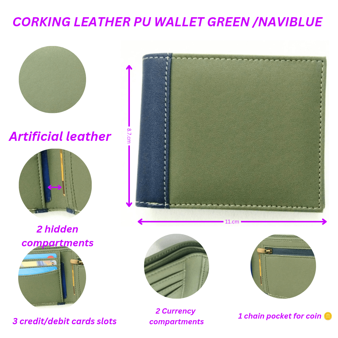 corking artificial leather wallet Experience the perfect blend of style, functionality, and ethical craftsmanship with this corking artificial leather wallet meticulously handcrafted artificial leather wallet. Made from premium, durable artificial leather, this wallet offers the luxurious look and feel of genuine leather without any harm to animals. The thoughtfully designed interior features two spacious note compartments, allowing you to organise your cash with ease. For added security, two discreet hidden slots provide a safe place for valuable cards or documents. Three conveniently placed credit/debit card slots ensure quick and easy access to your most frequently used cards. A zippered coin pocket keeps loose change contained and prevents it from cluttering your wallet. The meticulous stitching and high-quality materials guarantee long-lasting durability, making this wallet a reliable companion for years to come. Its slim profile easily slips into pockets without adding bulk, making it perfect for everyday use. Choose this handcrafted artificial leather wallet and make a conscious choice for a stylish and sustainable accessory.