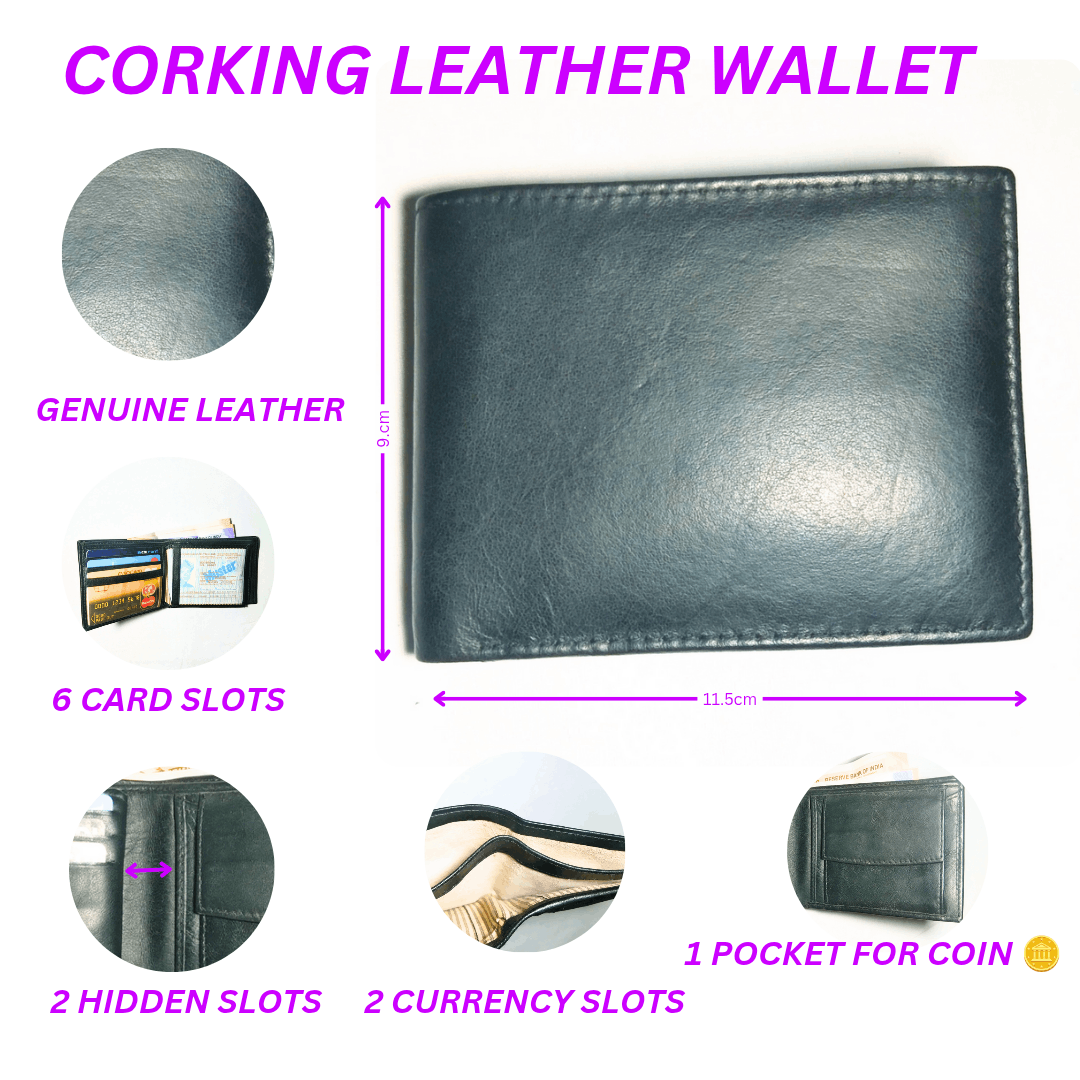 The Corking Genuine Leather Wallet is a handmade, slim, and stylish wallet crafted for both men and women. Made from premium-quality leather, it offers durability with a refined, elegant look. Its compact size (11.5×9 cm) ensures easy portability while providing ample storage space.