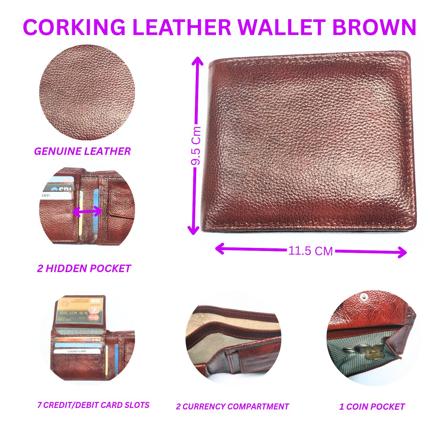 Discover the Corking Leather Wallet – crafted from premium genuine leather with 7 card slots, 2 currency compartments, 2 hidden pockets, and 1 coin pocket. Compact size: 11.5 cm × 9.5 cm. Durable, stylish, and perfect for everyday use.